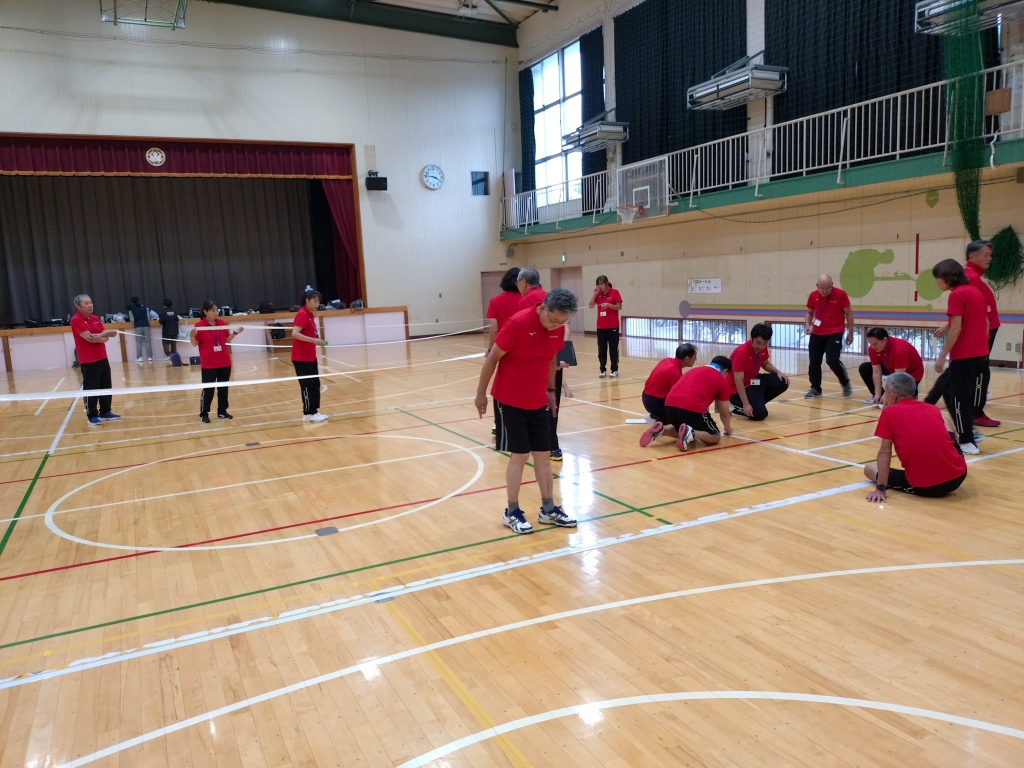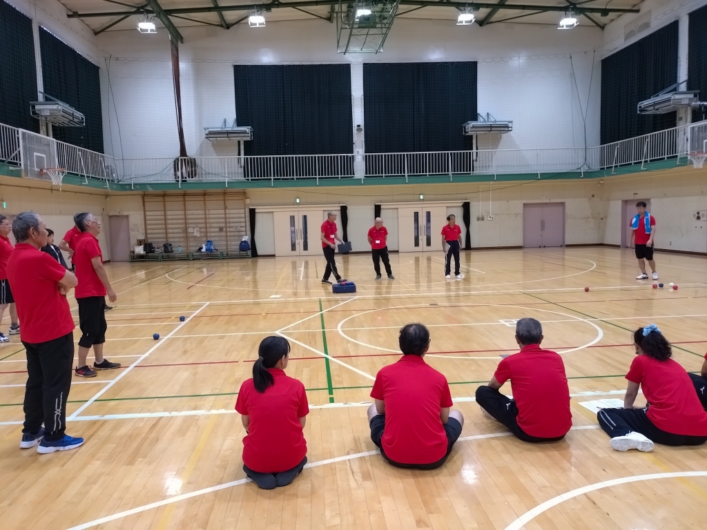 すべての研修を終えて、みんなで中央に集まり質疑応答をしました。ボッチャでは試合中は入ったボックスから出れない事になっていますが、ルール上、投げた後のラインクロスはOKなのが矛盾しているのではないかと激論が交わされました。今年もコミュニティスポーツ大会の審判研修は無事終わりました。10月から始まるコミュニティスポーツ地区大会にみなさまのご参加お待ちしております。