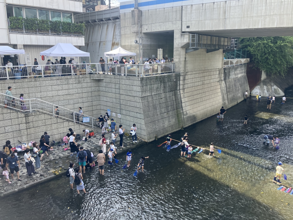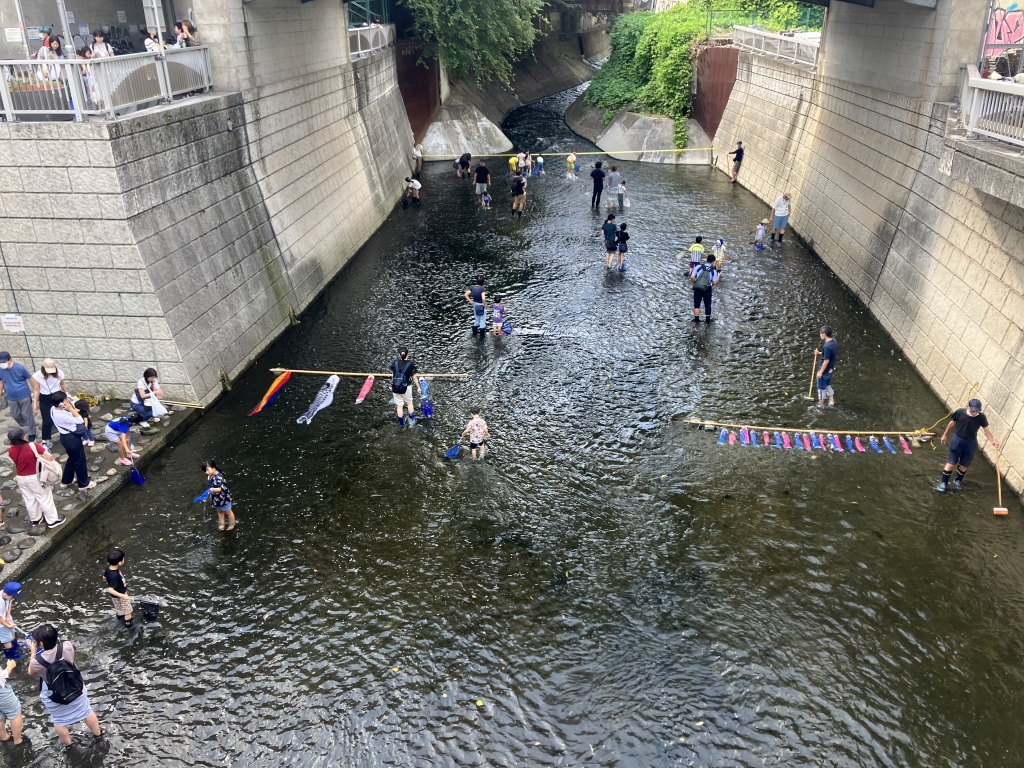 地域センターに隣接する「神田川親水テラス」では、テラス開放と鯉のぼり川流しが行われ、
