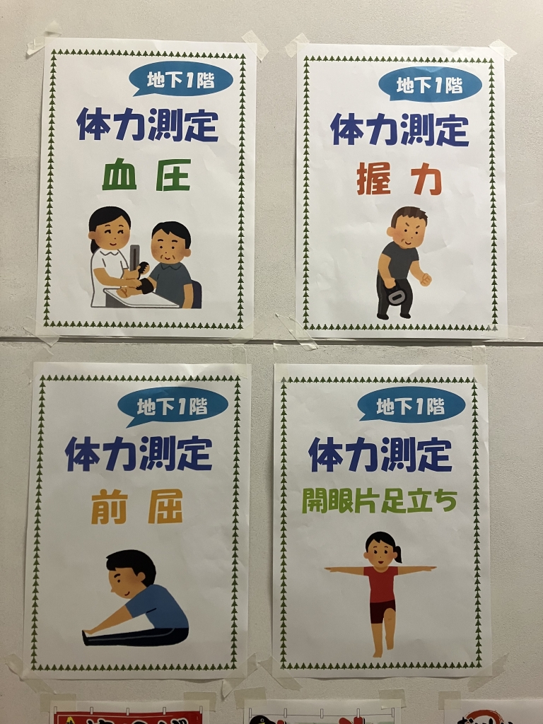 左手前から、血圧、握力、奥が長座前屈、その右手前が開眼片足立ちのコーナーです。