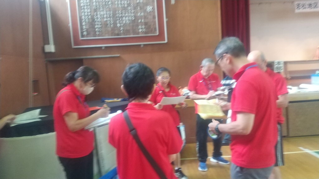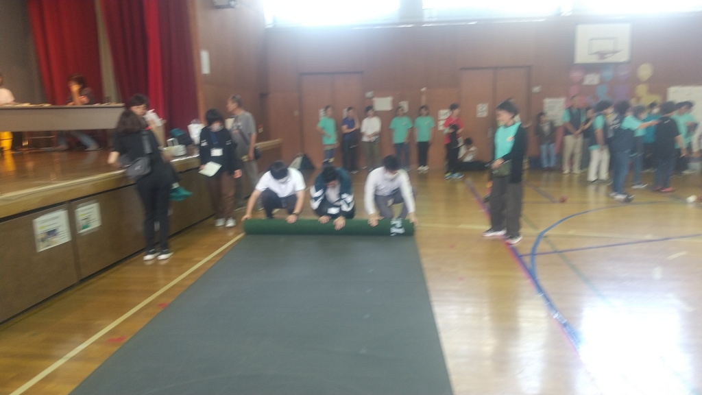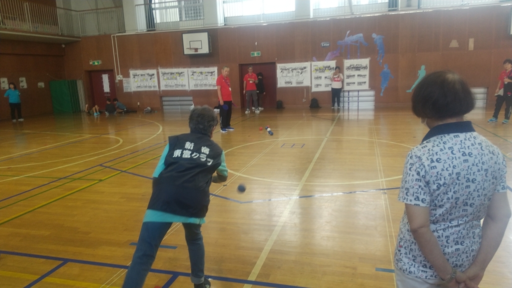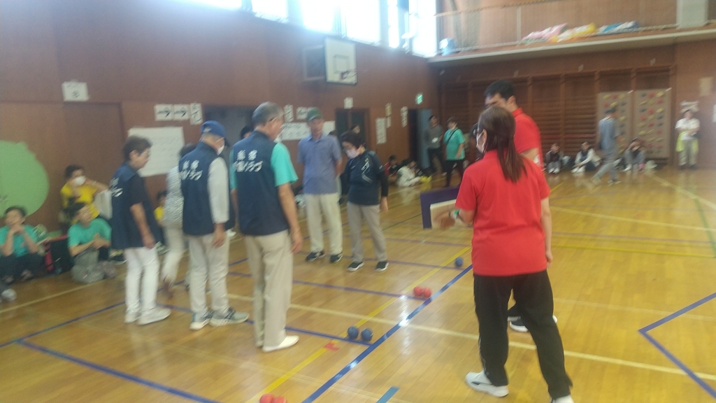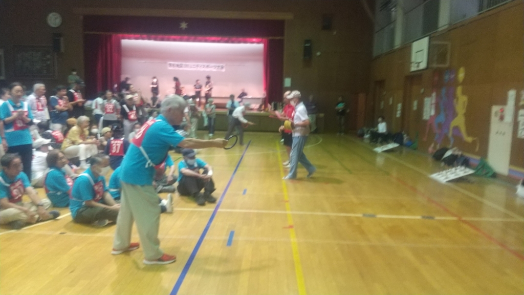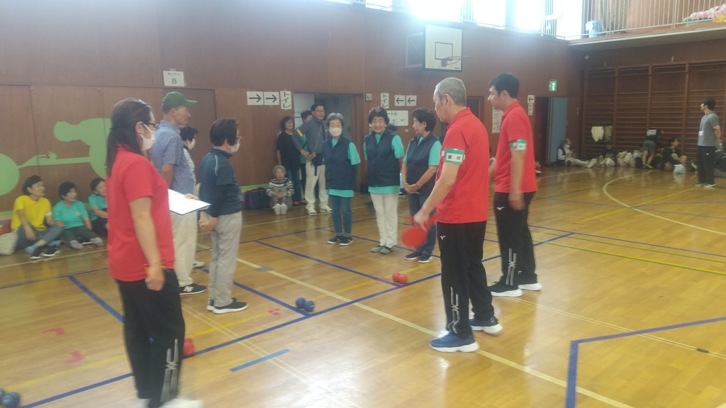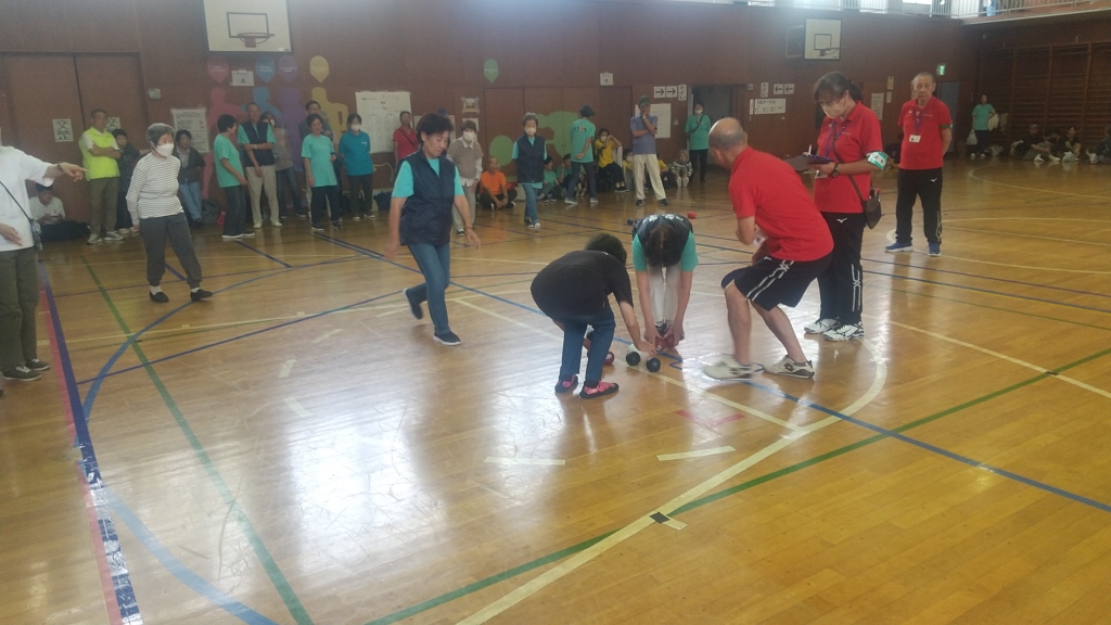 10月5日(日)若松地区コミュニティ大会が余丁町小学校体育館で開催されました。スタッフ集合は8時15分。午前、午後に分かれ、午前中はユニカール、ボッチャ。ユニカールは3チーム参加、ボッチャは17チームの応募があったが、当日は16チーム参加。ボッチャは当日抽選を行い、5ブロックに分かれ、リーグ戦を行いました。スポーツ推進委員は若松地区5名、他地区の応援が5名で合計10名が主に審判を行い、ユニカールは2名、ボッチャは8名に分かれました。ユニカールは3チーム総当たり戦で3試合のため、中央大会と同じ1試合6回戦で行いました。結果は全チーム、1勝1敗のため、ターゲット戦で1位〜3位の順位を決めました。ユニカールの順位が決まった後も、ボッチャは各コートで大熱戦を行っており、3コート作成したコートで、スポーツ推進委員が2名ずつ主審、副審になり、審判を行っていました。