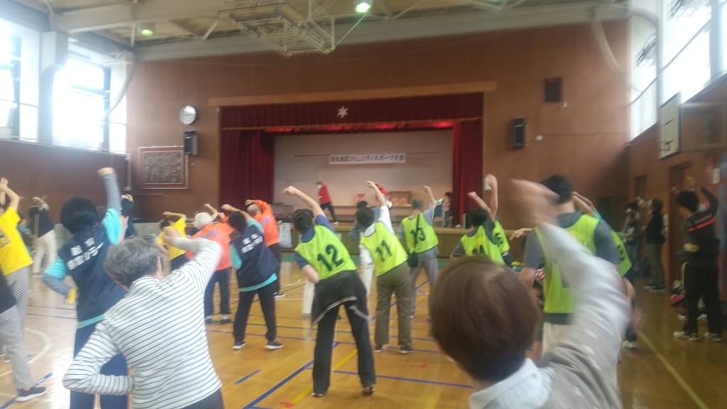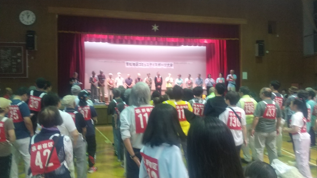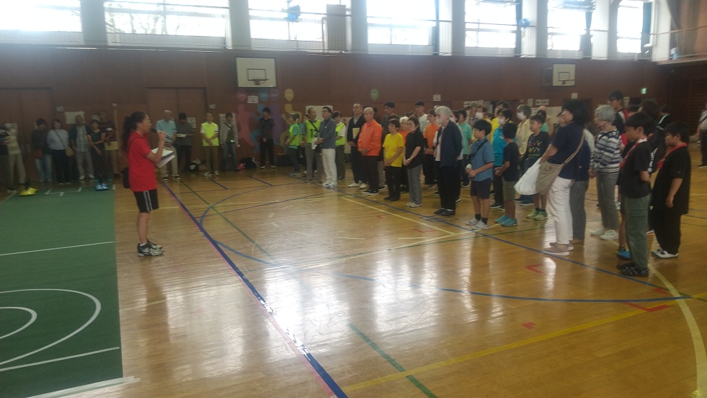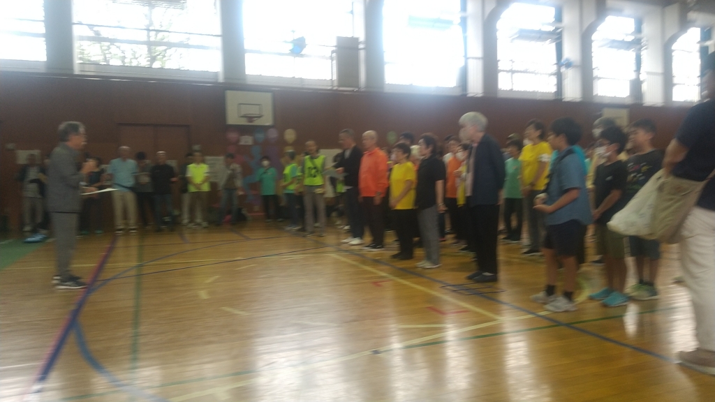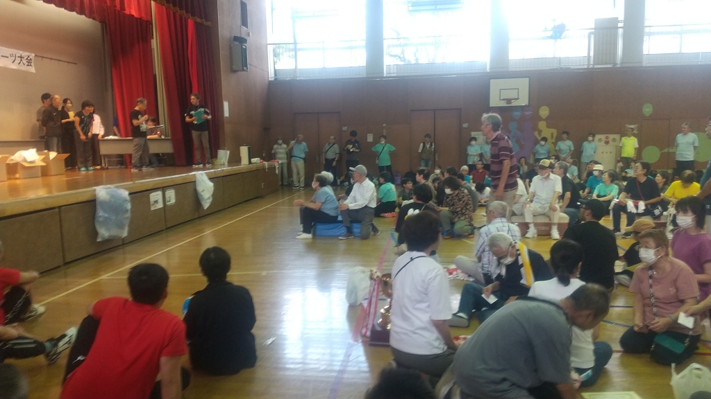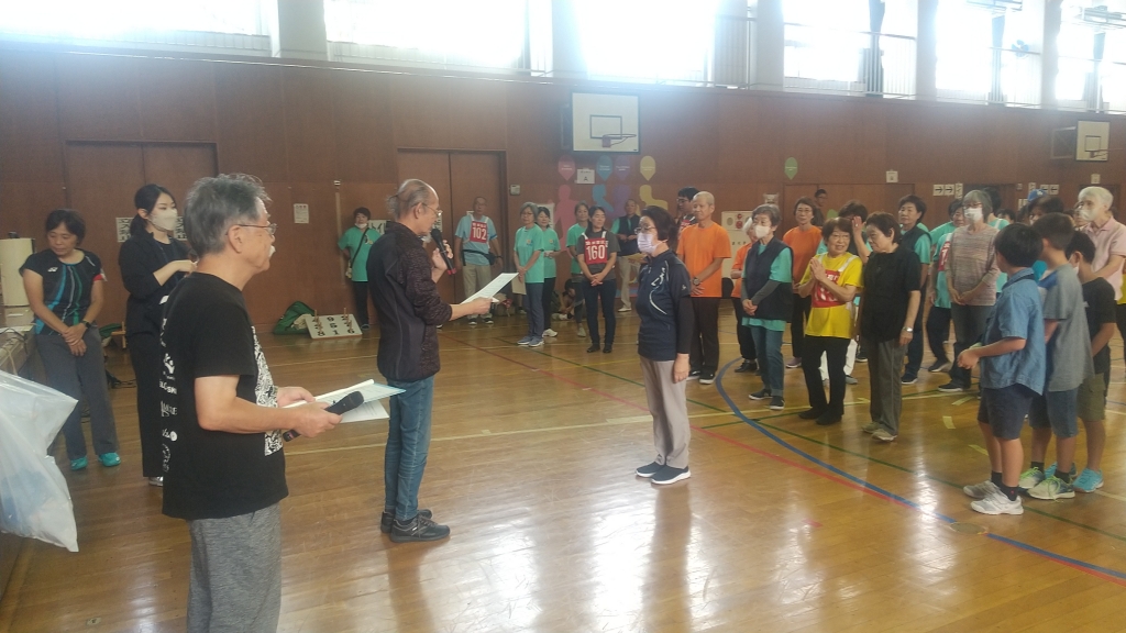 15時前にはすべての台の競技が終わり、集計を待つ間、クールダウンの体操をスポーツ推進委員が行いました。。賞状の筆耕にも時間がかかるため、初めての企画、じゃんけん大会で景品を出し、会場を盛り上げました。最後の表彰式は輪投げの個人賞1位〜3位、ブービー賞。団体戦(3名)1位〜3位。町会賞(2チームの合計得点)1位〜3位と賞品がたくさんあります。この大会、子どもの参加が前回より多く、お年寄りを含めたみなさんの笑顔がきわだった大会でした。スポーツ推進委員、スタッフのみなさん、参加した選手の方々、お疲れ様でした。